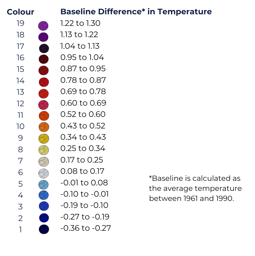 Below is the climate scarf temperature data Dr Mick Pope used to work out the colour order of our scarf pattern: