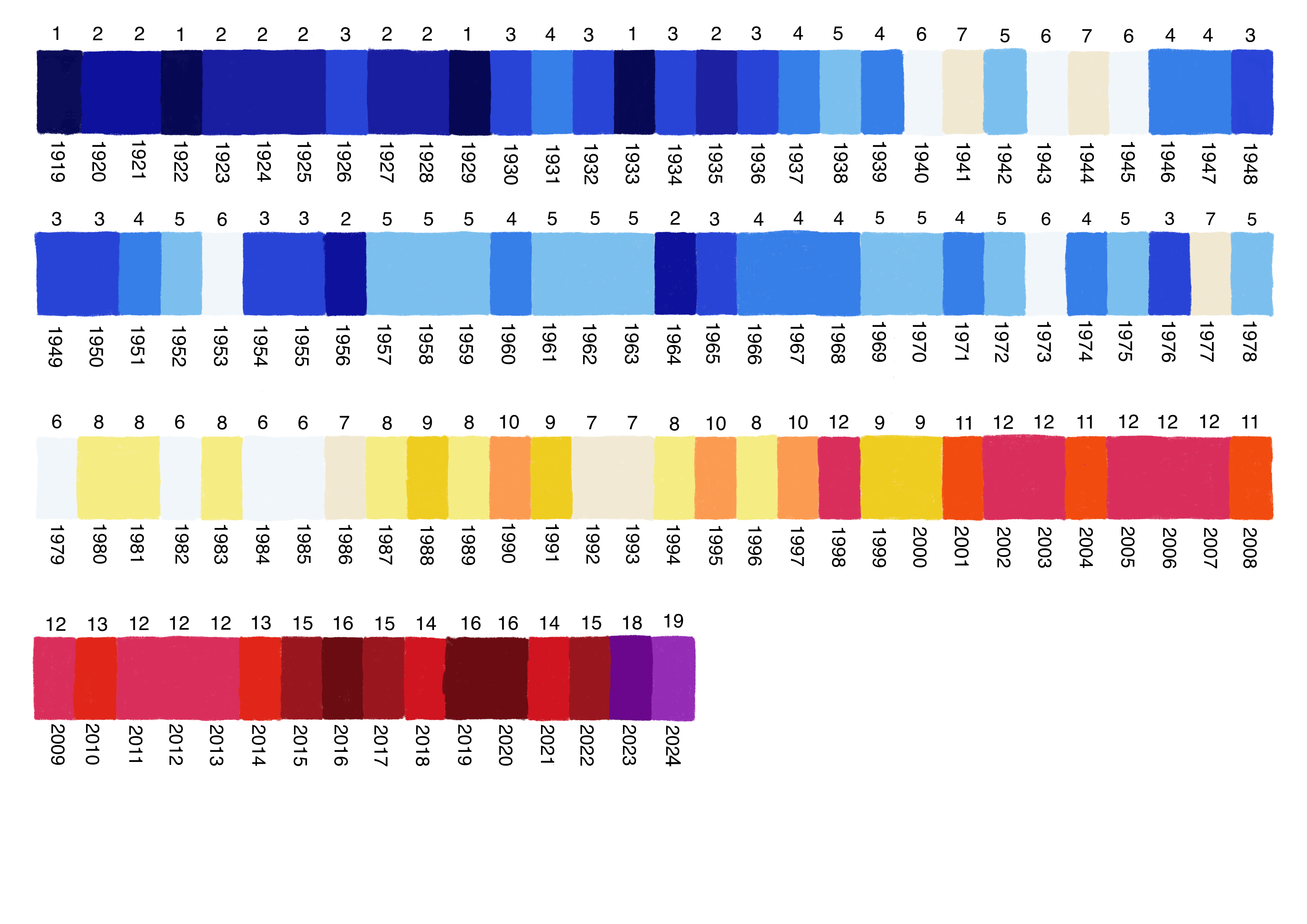Each band of colour represents a single year and the hue of colour (blue to red) represents global average surface temperatures for that year. If we take the temperatures of 1961 to 1990 to be our baseline, then blue colours are for years where the average temperature at the Earth's surface was colder than that baseline, and red are for years that were warmer. The stronger the blue, the colder the year; the stronger the red, the hotter. 2023's record breaking heat added a colour to our pattern, and took the stripes into a new purple tone. 2024 continued this trend, requiring a further purple colour to be added.